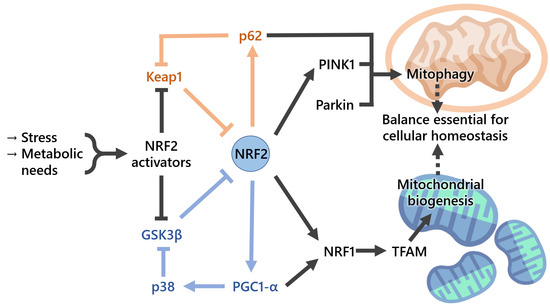 NRF2 plays an important role in mitochondrial and cellular homeostasis. Simplified representation of mitophagy and mitochondrial biogenesis pathways mediated by p62 and PGC1-α, respectively, upon activation by NRF2, evidencing the regulatory loop involving p62, KEAP1, and NRF2 (orange), correlated with mitophagy, and the regulatory loop involving PGC1-α, p38, GSK3β, and NRF2 (blue), associated with mitochondrial biogenesis. NRF2 activators include native proteins, such as AKT, but also xenobiotics, such as RTA-408 or sulforaphane, with the potential to be used in therapeutic strategies.