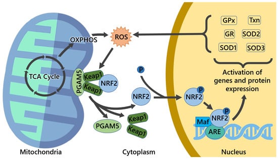 Modulation of NRF2 by mitochondrial ROS leads to the activation of ARE-associated genes and the expression of antioxidant proteins such as GPx (glutathione peroxidase), GR (glutathione reductase), TXn (thioredoxin), SOD1, SOD2, and SOD3 (superoxide dismutase 1, 2, and 3, respectively). When redox imbalance occurs, free radicals are generated, inducing NRF2 release from KEAP1, which, upon proteasomal degradation, translocates to the nucleus and binds to ARE to start the transcription of antioxidant enzymes to, in turn, counteract the oxidative stress from mitochondria and/or the whole cell. PGAM5 is a mitochondrial protein with an important role in mitochondrial dynamics and homeostasis that interacts with both NRF2 and KEAP1, composing a ternary complex, NRF2–KEAP1–PGAM5, reinforcing the crucial role in the health maintenance of mitochondrial function and homeostasis.