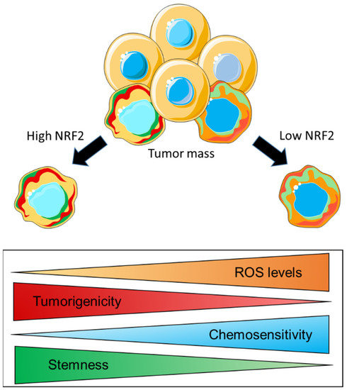 NRF2 regulates crucial aspects of CSCs’ biology by controlling their redox homeostasis. As shown in this schematic representation, within the tumor mass, normal cancer cells and CSCs coexist. Among them, two different phenotypes are observed, most likely reflecting the extent of NRF2 activation. The CSC on the bottom left is characterized by high NRF2 content, low intracellular ROS levels, and high stemness and tumorigenicity but low chemosensitivity. On the opposite side of this spectrum, the CSC on the bottom right has low NRF2 content, low tumorigenicity, and a high content of intracellular ROS, resulting in high differentiation and high chemosensitivity. The figure was created starting from freely available cartoons (https://smart.servier.com/smart_image/in-situ-cancer/, accessed on 27 June 2022).