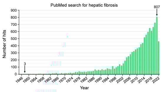 Hepatic fibrosis is a common type of liver disease that is attracting increasing attention of basic scientists and clinicians worldwide. This is best documented in a simple PubMed search. When searching this database with the search terms “liver fibrosis” or “hepatic fibrosis”, one will find a total of 20,173 or 10,048 entries in the 34 million citations listed on the database (search conducted on 31 July 2022). Notably, the number of articles dealing with the respective topics permanently increased from year to year (Figure 1).