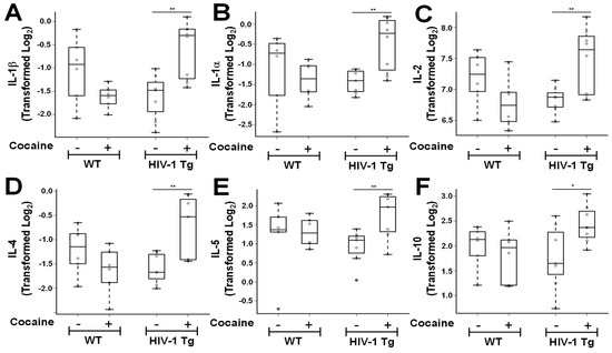 Cocaine self-administration regulates cortical interleukin levels in HIV-1Tg rats. Equivalent total protein lysates from the frontal cortex (fCTX) were assayed for interleukin levels from WT saline-yoked (n = 7), WT cocaine SA (n = 8), HIV-1Tg saline-yoked (n = 6), and HIV-1Tg cocaine SA (n = 6) male rats. Protein levels for IL-1β (A), IL-1α (B), IL-2 (C), IL-4 (D), IL-5 (E), and IL-10 (F) are shown. Log2 transformation was performed prior to statistical analyses since some expression levels were not normally distributed. * p < 0.05, ** p < 0.01.