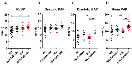 Schistosoma egg exposure increases pulmonary arterial pressure in HIV mice. Mean values of (A) right ventricular systolic pressure (RVSP), (B) systolic, (C) diastolic, and (D) mean pulmonary arterial pressure (PAP) in Wt and HIV mice exposed or unexposed to Schistosoma. Results are expressed as means ± SEM (n = 10–17). *, ** and *** indicate p < 0.05, p < 0.01, and p < 0.001, respectively (one-way ANOVA analysis followed by the Tukey post-hoc test).