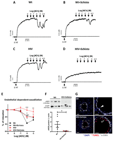 Endothelial dysfunction in HIV mice is aggravated by Schistosoma egg exposure. (A–D) Original recordings of the relaxation induced by Acetylcholine (ACh) in serotonin-stimulated PA from Wt and HIV mice exposed and unexposed to Schistosoma. (E) Relaxant effects of the endothelium-dependent vasodilator ACh in serotonin-stimulated PA. (F) Lung endothelial NO synthase (eNOS) protein expression. (G). Representative immunofluorescence images of TUNEL (red) and α-SMA (gray) staining in lungs of Wt (upper panel) and HIV+Schisto (lower panel) mice, including higher magnifications (white squares) of TUNEL-negative (close arrowhead) and TUNEL-positive (open arrowhead). Scale bar 50 µm. Values are mean ± SEM (n = 5–6). * p < 0.05, ** p < 0.01, and *** p < 0.001, as determined by two-way repeated measures ANOVA analysis followed by the Bonferroni’s post-hoc test (panel (E)) or Student’s unpaired t-test (panel (F)).