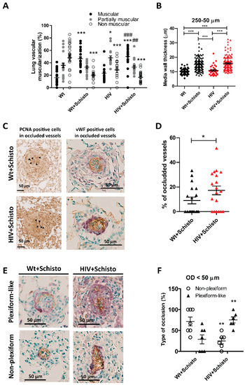 Co-exposed animals show enhanced obliterative pulmonary vascular remodeling. (A) Percentage of muscular (black), partially muscular (gray), and non-muscular (white) vessels (n = 16–23 mice per group). * and *** indicate p < 0.05 and p < 0.001, respectively vs. Wt; ## and ### indicate p < 0.01 and p < 0.001 vs. HIV, respectively. (B) Medial wall thickness of PA between 250 and 50 μm. Between 35 to 100 pulmonary vessels were analyzed per group (n = 8–13 mice). *** p < 0.001. Results are shown as mean ± SEM. One-way ANOVA analysis followed by Tukey post-hoc test was applied. ((C), left). Representative images of PCNA staining in occluded lesions (solid arrowheads point to representative PCNA+ cells). ((C), right) Representative images of occluded lesions where cellular identity was visualized by antibodies against α-smooth muscle actin (purple/violet color) and von Willebrand factor (vWF, brown color) in Wt (upper panel) and HIV (lower panel) mice exposed to Schistosoma eggs. Results are expressed as mean ± SEM. * p < 0.05 and *** p < 0.001 (one-way ANOVA analysis followed by Tukey post-hoc test). (D) Percentage of occluded vessels in Wt and HIV mice exposed to Schistosoma eggs (n = 19 mice per group). (E) Representative cross-sectional views of α-smooth muscle actin (purple/violet color) and von Willebrand factor (vWF, brown color) staining of plexiform-like (upper panels) and non-plexiform-like type (bottom panels) of occluded vessels (magnification 40x; scale bar 50 µm). (F) Percentage of severe occluded vessels of outer diameter <50 µm. Results are expressed as mean ± SEM. * p < 0.05 and ** p < 0.01 versus Wt+Schisto determined by unpaired Student’s t-test.
