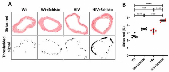 HIV mice show augmented pulmonary perivascular fibrosis with marked exacerbation after exposure to schistosome eggs. (A) Representative images of pulmonary vessels stained with Sirius red (upper panels). Stained vessel areas are shown as thresholded signal (botton panels). (B) Quantification of Sirius red staining as percent Sirius red-positive area fraction (as shown in (A), bottom) in the vessel area analyzed. Mice and vessels analyzed per group were: Wt (6, 77), Wt+Schisto (5, 83), HIV (5, 53), and HIV+Schisto (5, 75). Results are expressed as mean ± SEM. *** p < 0.001 and **** p < 0.0001 as determined by one-way ANOVA analysis followed by Tukey’s post-hoc test.