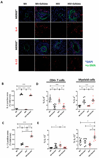 Type 2 cytokines (i.e., IL-4 and IL-13) are typically associated with the granulomatous response to parasite eggs in schistosomiasis. Pulmonary IL-4 expression was hardly detected in untreated Wt and HIV mice but strongly induced in granulomas of egg-treated mice (Figure 6A), and mostly in perivascular areas and to a lesser degree in intravascular locations. Quantification of the fluorescent cytokine signal confirmed these results (Figure 6B). Intracellular flow cytometry analysis (Figure 6D) showed that in untreated mice, either Wt or HIV, IL-4 is mainly expressed by CD4+ T cells. After egg administration, the relative abundance of IL-4+ CD4 T cells was reduced in both mice, with a concomitant increase in that of IL-4+ myeloid cells.