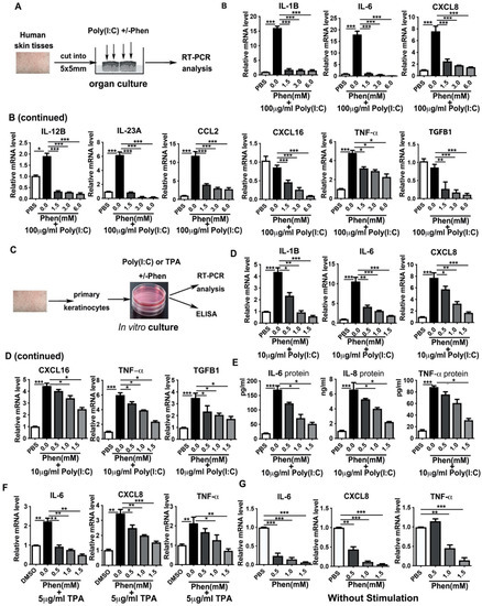 Phenformin suppresses the expression of pro-inflammatory cytokines in human keratinocytes. (A) Scheme of human skin organ culture: skin tissues were treated with 100 μg/mL Poly (I:C) with or without different concentrations (0, 1.5, 3.0 or 6.0 mM) of phenformin (Phen) or PBS as a negative control for 24 h, then were collected for RT-PCR analysis of cytokine expression. (B) Total mRNAs were extracted from skin tissues from (A) and qRT-PCR was used to analyze the expression of the indicated pro-inflammatory cytokines; results were normalized to levels of 36B4 mRNA. (C) Scheme of in vitro culture of primary human keratinocytes treated with 10 μg/mL Poly (I:C) or with 5 μg/mL TPA with or without different concentrations (0, 0.5, 1.0 or 1.5 mM) of phenformin (Phen) or PBS as negative control for 24 h, after which the cells were collected for RT-PCR analysis of cytokine expression. (D) Total mRNAs were extracted from keratinocytes treated with Poly (I:C) combined with phenformin and qRT-PCR analysis of expression of the indicated pro-inflammatory cytokines; results were normalized to levels of 36B4 mRNA. (E) ELISA analysis of the indicated cytokine protein levels in the conditioned medium collected from keratinocytes treated with Poly (I:C) combined with phenformin as in (C). (F) Total mRNAs were extracted from keratinocytes treated with TPA combined with phenformin and qRT-PCR analysis of the expression of the indicated pro-inflammatory cytokines; results were normalized to levels of 36B4 mRNA. (G) Total mRNAs were extracted from keratinocytes treated with PBS or with different concentrations (0, 0.5, 1.0 or 1.5 mM) of phenformin and qRT-PCR analysis of the expression levels of the indicated pro-inflammatory cytokines; results were normalized to levels of 36B4 mRNA. (B,D–G): Student’s t test analysis was used for all quantification data to compare each different concentration group as indicated with the 0.0 concentration of phenformin, n = 3, standard deviation bars are shown, * p < 0.05; ** p < 0.01; *** p < 0.005.
