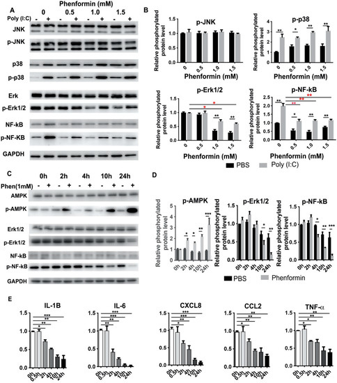 Phenformin suppresses the expression of pro-inflammatory cytokines in human keratinocytes but not directly through inhibition of the NF-κB or MAPK signaling pathways at early time points. (A,B) Primary human keratinocytes were treated with 10 μg/mL poly (I:C) with (+) or without (−) different concentrations (0, 0.5, 1.0 or 1.5 mM) of phenformin as indicated. At 24 h after treatment, cells were collected for Western blot analysis of total and phosphorylated levels of JNK, p38, Erk1/2 and NF-κB proteins; GAPDH was used as a loading control. The levels of the phosphorylated forms of these proteins relative to the control PBS-treated cells (expression level as 1) are shown in (B), and densitometry measurements for phosphorylated forms were normalized to the amounts of total proteins, respectively. (C,D) Primary human keratinocytes were treated with 1.0 mM phenformin (Phen) (+) or with PBS (−) and cells were collected at different time points for Western blot analysis of total and phosphorylated levels of AMPK, Erk1/2 and NF-κB proteins; GAPDH was used as a loading control. Levels of the phosphorylated forms of these proteins relative to the control PBS-treated cells (expression level as 1) are shown in (C), and densitometry measurements for the phosphorylated forms were normalized to the amounts of total proteins. (E) Primary human keratinocytes were treated with the same conditions as described for C and cells were collected at different time points as indicated for qRT-PCR analysis of the expression of the indicated pro-inflammatory cytokines; all mRNA expression levels were normalized to levels of 36B4 mRNA and are shown as relative to the control group (PBS treated, as 1). (B,D,E): Student’s t test analysis was used for all quantification data to compare two different concentration groups as indicated, n = 3, standard deviation bars are shown, * p < 0.05; ** p < 0.01; *** p < 0.005.