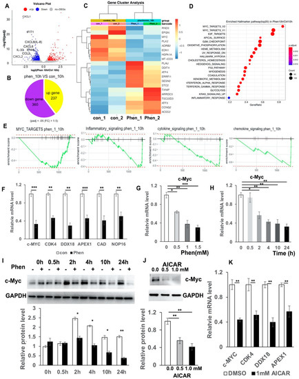 RNA-seq analysis reveals that phenformin suppresses c-Myc expression in human keratinocytes. (A) Volcano plot visualizing DEGs between phenformin (1 mM)-treated cells (phenformin_10h) and the control PBS-treated cells at 10 h (control_10h); a p value < 0.001 was used as a threshold to determine the significance of DEGs. Red dots represent up-regulated DEGs, blue dots represent down-regulated DEGs and gray dots indicate transcripts that did not change significantly between the two groups Some pro-inflammatory cytokines from down-regulated DEGs are indicated. (B) Circle graph presenting the number of DEGs between the phenformin-treated group and the control group at 10 h. (C) Gene cluster analysis of DEGs between phenformin-treated (Phen_1, Phen_2) and control cells (con_1, con_2) was conducted based on the FPKM value of each sample. The X axis represents the different samples, whereas the Y axis represents DEGs. The color (from blue to red) represents DEG expression intensities from low to high, respectively. (D) Top 20 enriched Hallmarker pathway of DEGs ranked by gene ratio, the X axis shows the gene ratio, which is defined as the percentage of significant genes over the total genes in a given pathway; the left Y axis shows the top 20 pathway names. The darker the color the smaller the q value; bubble size indicates the number of DEGs. (E) Enrichment plots for 4 selected datasets enriched in GSEA Hallmark analysis from (D), showing the profile of the running ES Score and positions of gene set members on the rank-ordered list. (F) Relative mRNA expression levels of c-Myc and its downstream targets CDK4, DDX18, APEX1, CAD and NOP16, normalized by the human 36β4 gene, in human keratinocytes treated with control PBS (con) or with 1 mM phenformin at 10 h by RT-PCR analysis. (G,H). Relative mRNA expression levels of c-Myc normalized by the human 36β4 gene, in human keratinocytes treated with different concentrations (0, 0.5, 1.0 or 1.5 mM) phenformin (Phen) at 10 h (G); or treated with 1 mM phenformin and collected at different time points (0, 0.5, 2, 4, 10 and 24 h) (H), by RT-PCR analysis. (I) Western blot analysis of c-Myc protein levels in human keratinocytes treated with 1 mM phenformin and collected at different time points (0, 0.5, 2, 4, 10 and 24 h). Densitometry measurements of the relative expression level of c-Myc normalized to the loading control GAPDH are shown in the lower panel. (J) Western blot analysis of c-Myc protein levels in human keratinocytes treated with 0.5 or 1.0 mM AICAR for 24 h. Densitometry measurements for the relative expression level of c-Myc normalized to GAPDH as a loading control are shown in the lower panel. (K) Relative mRNA expression levels of the indicated genes normalized by the human 36β4 gene, in human keratinocytes treated with 1.0 mM AICAR for 12 h. Student’s t test analysis was used for all quantification data to compare two different concentration groups as indicated, n = 3, standard deviation bars are shown, * p < 0.05; ** p < 0.01; *** p < 0.005.