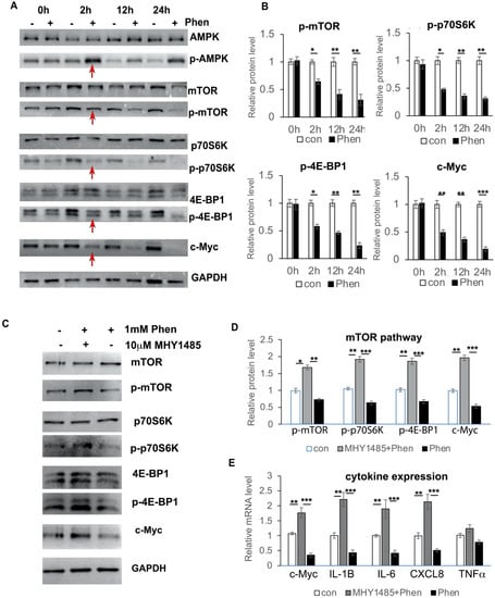 It has been shown that c-Myc expression is down-regulated by the AMPK/mTOR pathway, both in pancreatic tumor cells and in leukemia cells; therefore, we investigated whether phenformin also controls c-Myc expression through the mTOR pathway in keratinocytes. First, we treated keratinocytes with or without 1 mM phenformin and collected cells at different time points to check activation of the mTOR pathway. We found that phenformin could suppress the activation of the mTOR pathway, indicated by the reduced phosphorylated level of mTOR, as well as its downstream targets p70S6K and 4E-BP1, as early as 2 h after treatment, which was associated with the decreased expression of c-Myc in keratinocytes (Figure 6A,B). Then, we treated keratinocytes with the mTOR activator MHY1485 together with phenformin and found that activation of the mTOR pathway by MHY1485 resulted in an increased expression of c-Myc, which counteracted the phenformin-suppressing effect in keratinocytes (Figure 6C,D). Importantly, the mTOR activator MHY1485 enhanced the expression of cytokines, such as IL-6 and IL-8, to rescue the suppression of cytokine expression by phenformin (Figure 6E). The sum of these results indicated that phenformin down-regulates cytokine expression by targeting c-Myc through down-regulation of the mTOR pathway.