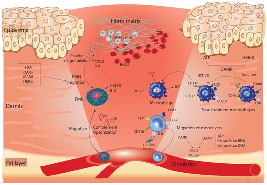 The origin of macrophages within the wound is either tissue-resident macrophages (CCR2lo, Cx3CR1hi) that form a small proportion of macrophages within the wound or, more frequently, the monocyte-derived population (CCR2hi, CX3CR1lo), which can increase in number in response to inflammatory stimuli (reviewed in [34]). The presence of macrophages, particularly the inflammatory type, is controlled mainly by proinflammatory mediators and chemokines, including RANTES/CCL5 and monocyte chemotactic protein-1 (MCP-1), which are released from platelet degranulation, fibrin clots, keratinocytes, fibroblasts, and leukocytes themselves [35]. At the end of the inflammatory phase, macrophages are the dominant cell type in the wound and maintain antimicrobial activity through the production of IL-1, IL-6, TNF, and inducible nitric oxide synthase (iNOS) [32,33]. Figure 1 summarizes the main changes that occur in the skin during coagulation and the early inflammatory phase of healing.