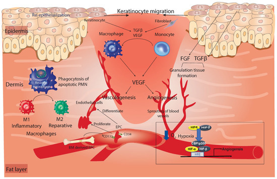 This phase comprises cellular proliferation, migration, and the active repair of damaged blood vessels and dermis. Morphologically, the damaged dermis is replaced by granulation tissue, which is composed of invading capillaries that give it a granular appearance [1]. The repair of the damaged blood vessels can occur through two mechanisms: angiogenesis and vasculogenesis [36]. In angiogenesis, blood vessels sprout from intact capillaries to replace the damaged vessels in a process that is regulated by alterations in the oxygen gradient. Hypoxia-inducible factor (HIF) is the master regulator of this process. During hypoxic conditions, the HIF-α subunit dimerizes with the HIF-β subunit, and the complex binds to the hypoxia response element (HRE) on the target genes in a process that requires the presence of the co-factor, core-binding factor (CBP)/ protein 300 (p300), thus activating a panel of genes needed for vascular growth and angiogenesis (Figure 2) [37]. In vasculogenesis, endothelial progenitor cells (EPC) expressing CD34 and CD133 markers for early EPCs, together with VEGFR, are released from the BM into the circulation in which they migrate to sites of vasculogenesis. In those sites, they can proliferate or differentiate into endothelial cells and form aggregates of endothelial cells independent of existing capillaries (Figure 2) [36]. The most important regulator of both neovascularization processes is the macrophage-derived vascular endothelial growth factor (VEGF), which switches to epidermal-derived VEGF during the late stages of tissue repair [38]. Other sources that produce VEGF growth factors are keratinocytes, fibroblasts, and mast cells [39,40].