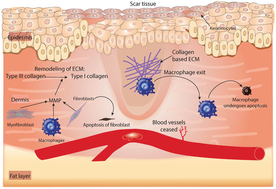 After the closure of the wound epidermis, the collagen produced within the dermis is remodeled through a process that balances collagen formation and collagen break-down with the assistance of myofibroblasts differentiated from fibroblasts. The remodeling of collagen occurs in response to the release of matrix metalloproteinase from macrophages, fibroblasts, and epithelial cells [57]. Matrix metalloproteinases convert type III collagen into a stronger form of collagen (type I) (Figure 4) [58]. Cellular components, such as fibroblasts, macrophages, and endothelial cells, are removed from the wound at this stage by apoptosis [59], leaving the wound with a bulk collagen bundle that contains very few cells. Collagen deposition is fine-tuned by the combined effects of TGF-β1 and TGF-β3, which indicates the implications of their exogenous addition in the development of fibrosis and scar tissue formation [14,60,61,62]. As tissue remodeling proceeds, the blood vessel number and blood flow decline, forming an avascular environment (Figure 4). Ideally, remodeling should begin 2–3 weeks post-injury and may take several months. In some conditions, when tissue remodeling is deregulated, excess ECM tissue is formed, and the hypercrosslinking of collagen occurs and extends beyond the wound area into the normal dermis, failing to regress over time and forming a condition known as keloids. Alternatively, and in response to surgery or burns, the skin can generate excess collagen bundles, creating hypertrophic scars that may regress within six months (reviewed in [63]). This overhealing that occurs in the form of hypertrophic scars and keloids is related (non-exclusively) to the excessive production of TGF-β (reviewed in [64]). The challenge of hypertrophic scars is that, when they appear over a tendon or in a critical area, they can be disfiguring or can prevent the normal mobility of a joint [7].