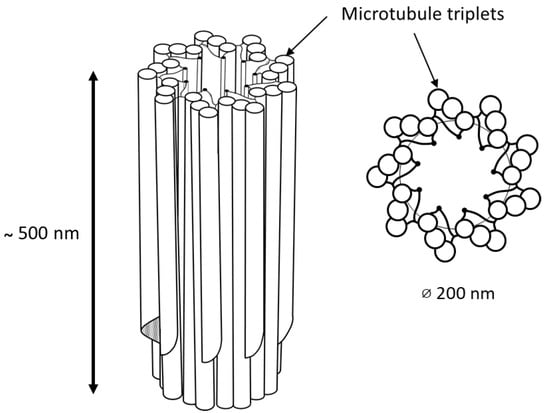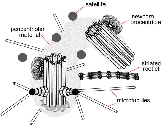 In animal cells, the centrosome is a membrane-less organelle consisting of two interconnected centrioles, PCM and some additional structures []. The centriole is a cylinder shape structure with a diameter of about 200 nm and a length of about 500 nm made of nine triplets of microtubules (Figure 1).