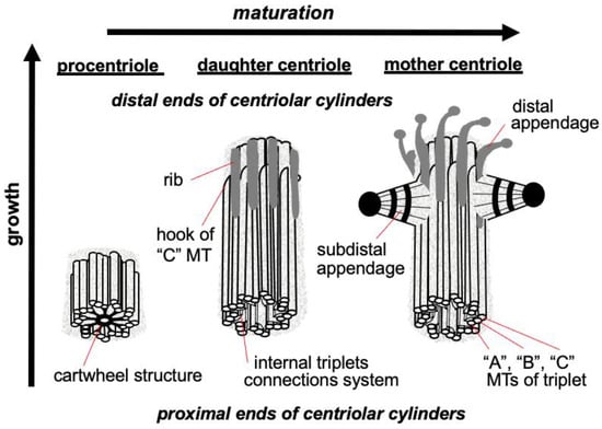 The triplets of microtubules are always twisted counterclockwise when viewed from the proximal end of the centriole []. Each triplet is composed of microtubules A, B and C, with microtubule C being shorter than the other two and ending in a characteristic hook at the distal end of the centriolar cylinder (Figure 2 middle). Three types of centrioles can simultaneously exist in a cell (Figure 2). The older and most mature centriole (at least 2 cell cycles old) is called the mother centriole in opposition to the younger one, called the daughter centriole (which appeared in the previous cell cycle), and possesses two kinds of appendages named distal and subdistal appendages. Each triplet of microtubules possesses one distal appendage which makes nine distal appendages per centriole []. During the formation of the primary cilium distal appendages are essential to attach the centriole to the plasma membrane []. The daughter centriole has electron-dense ribs at the site of the future formation of distal appendages (Figure 2, middle).