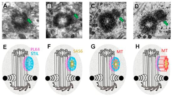 Ultrastructure of the early stages of centriole formation on the mother centriole in the G1 phase of the cell cycle ((A,B)—from [,,] with modifications) and localization of the proteins involved in this process (E,H) after [,]). The photographs show cells of the porcine embryonic kidney line (SPEV) fixed after mitosis at a time significantly less than the average (B) or even minimum (A,C,D) duration of the G1 phase of the cell cycle for this cell line []. (A,E)—at the stage of a dense disc, a complex of PLK4 kinase and STIL protein is formed on the centriole surface. (B,F)—at the stage of the removed disk, 9 dimers of the SAS6 protein are added to this complex, which, due to the interaction of their lateral domains, form the “cartwheel structure”. (C,G)—nucleation of centriole microtubules occurs at the ends of the “cartwheel structure” spokes; the figure shows MT singlets. (D,H)—MT singlets are completed to MT doublets and further to MT triplets. The length of procentrioles at the end of the G1 phase of the cell cycle is about 100 nm; further elongation of triplets is activated when the cell enters the S phase of the cell cycle. On the surface of the mother centriole, the schemes show 9 distal appendages and two subdistal appendages (such a number of subdistal appendages is typical for this cell line). Microtubules extending from the heads of subdistal appendages and pericentriolar material are not shown in the diagrams. Arrows show procentrioles. The photo and diagrams show only one (mother) centriole from a pair. It should be noted that the mother centriole in the diagrams is shown when viewed from the proximal end and the triplets are twisted counterclockwise at this point of view, the procentriole is shown when viewed from the distal end, so the triplets in the diagram are twisted clockwise []. Scale bar 200 nm.