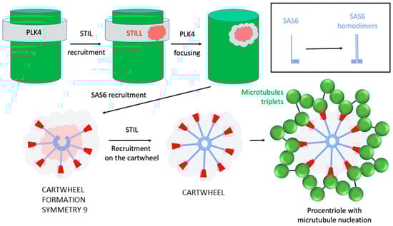 The cartwheel, first observed in 1960 in EM images of the base of flagella, is the structural unit of symmetry nine of centrioles []. This structure forms even before the nucleation of the microtubules that will form the procentriole. It is from this cartwheel that the growth of the procentriole will start (Figure 4). Once the first cartwheel is formed, others will be made to form a stack of cartwheels that will serve as a scaffold around which the nine triplets of microtubules will be organized.