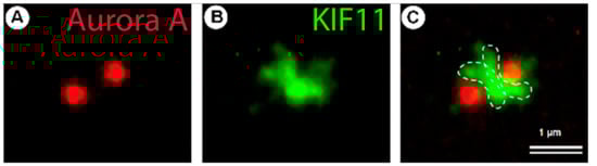 Kinesin-like motor KIF11 participate in centrosome separation in G2 phase of cell cycle. (A) Centrosomes labeled with monoclonal antibodies against Aurora A are shown in red, (B) localization of KIF11 between two centrosomes at the beginning its separation was detected with labelling by polyclonal antibodies against KIF11 in green; (C) double labelling show superposition. The dotted lines show the probable binding regions of the KIF11 protein to microtubules extending from two centrosomes. Scale bar 1 µm. Photos made by R. Uzbekov from [] with modifications.