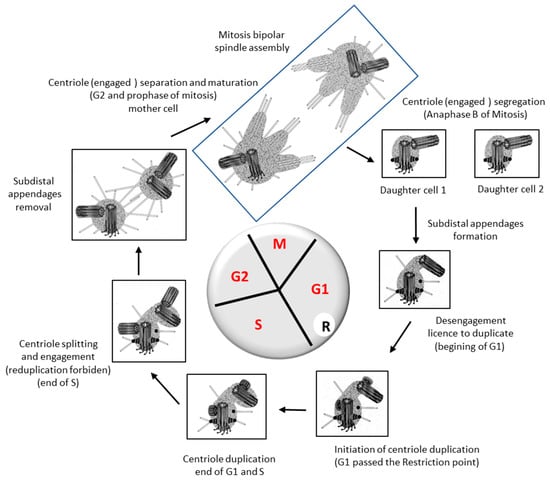 In G1 phase of the cell cycle the mother centriole with its appendages is connected to the daughter centriole, both centrioles are “disengaged” i.e., allowed to duplicate. The passage of the restriction point will trigger the initiation of their duplication.