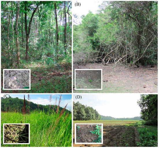 Sampling sites landscape in Cát Tiên National Park, Đồng Nai Province, Vietnam. (A) Forest (KT55). (B) The bottom of a dry reservoir (KT39). (C) Dry swamp (KT61). (D) Agricultural field (KT54).