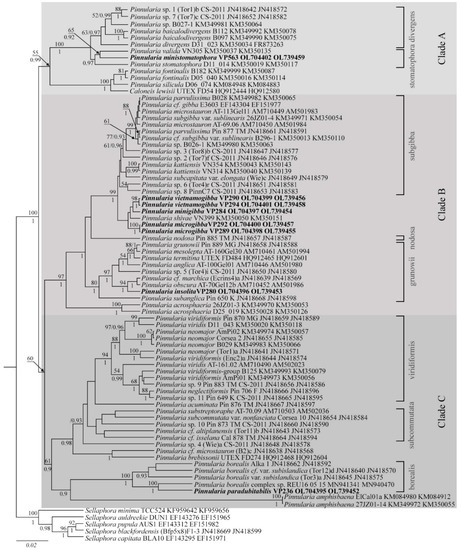 Comprehensive studies on Pinnularia phylogeny [24,25] confirm its monophyletic origin; the genus splits into three clades stably supported by the analysis. In a study by Souffreau et al. [25], who used five genetic markers—two nuclear (18S rDNA and 28S rDNA), two plastid (rbcL and psbA), and a mitochondrial cox1, these clades were designated A, B, and C. Each clade consists of several subclades characterized by morphological similarity about shapes (valves and apices, raphe endings linear or rounded, raphe fissures straight or undulate, chloroplasts H-shaped or elongated, with pyrenoids or not, etc.) and specific markings (ghost striae, fascia, wart-like bodies, etc.). Although our phylogenetic analysis involved only two markers (nuclear 18S rDNA and plastid rbcL), it perfectly preserved the tree topology and maintained high support to all clades and subclades introduced by Souffreau et al. [25]. The tree was expanded through the addition of the new taxa, which showed full morphological consistency with their parental subclades (Figure 2).