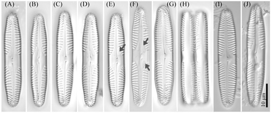 Pinnularia minigibba Kezlya, Maltsev, Krivova et Kulikovskiy sp. nov. Strain VP284, slide No. 07042. Light microscopy, differential interference contrast. (A–G,I,J) Valves face (arrows indicate the ghost striae). (H) Cell in girdle view. (A) Holotype. (I,J) Valves from the wild sample.