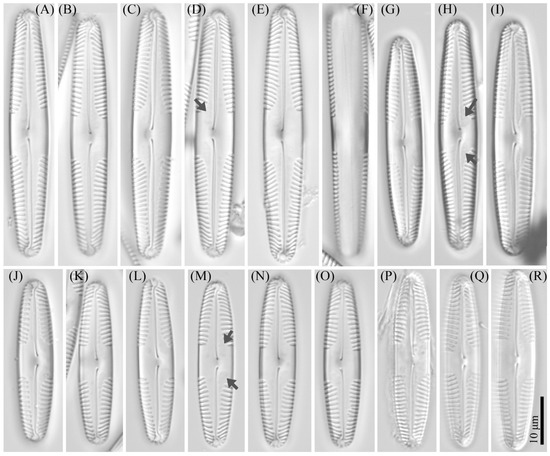 Pinnularia vietnamogibba Kezlya, Maltsev, Krivova et Kulikovskiy sp. nov. Strains VP294 slide No. 07052, VP290. slide No. 07048. Light microscopy, differential interference contrast. (A–E) Strain VP294, valve face (arrows indicate the ghost striae). (J–O) Strain VP290, valve face (arrows indicate the ghost striae). (F) Cell in girdle view. (A) Holotype. (G–I,P–R) Valves from the wild sample.