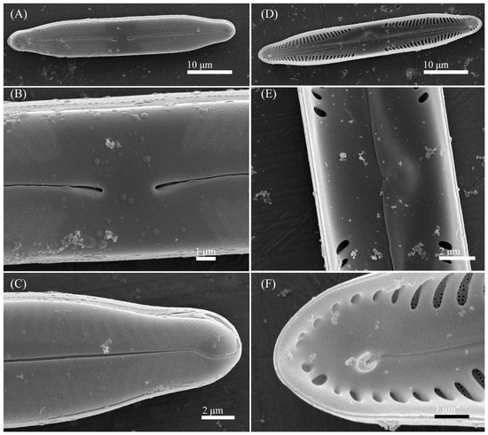 Pinnularia microgibba Kezlya, Maltsev, Krivova et Kulikovskiy sp. nov. Strain VP289 sample No. 07047. Scanning electron microscopy. (A–C) External views. (D–F) Internal views. (A,D) The whole valve. (B,E) Central area. (C,F) Valves ends. Arrows indicate the ghost striae.