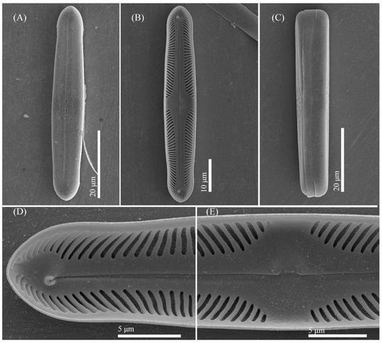 Ultrastructure: In external views raphe branches straight (Figure 4A–C), slightly unilaterally deflected in the proximal part, terminated small, drop-shaped ends. The distal raphe ends are sickle-shaped and extend to the valve margin (Figure 4C). The striae are composed of one large alveolus, each alveolus is composed of five rows of small areolae.