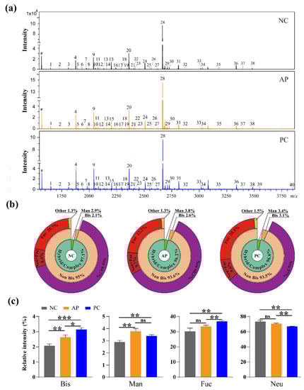 To confirm the glycosylation alterations in the serum proteins of PC patients, N-glycans were extracted from the pooled serum proteins of NC, AP, and PC groups and analyzed by MS (Figure 2a). All glycan signals in MS spectra were summarized in Table 1 and relative intensities of all N-glycan types in different groups that compared with the internal standard glycan were shown as sunburst charts (Figure 2b), along with the estimated distribution of different N-glycan types (Figure 2c). In total, 40 kinds of glycoforms (No. 1–40) were identified in the control and patients’ sera. Compared with the NC group, the relative abundances of bisecting glycans, mannosylation, and fucosylation were significantly increased in the PC group; compared with the AP group, the relative abundances of bisecting glycans and fucosylation were significantly enhanced in the PC group; however, the relative abundances of fucosylation seemed similar between the NC and AP groups. Together, the results of lectin blotting and mass spectrometry analysis revealed that the bisecting glycans were dramatically upregulated in PC patients and could distinguish PC patients from NC group (p < 0.001) and AP patients (p < 0.05).