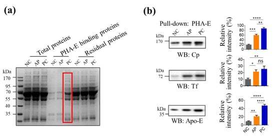 Detection of bisecting glycoproteins in PC patients’ sera. (a) PHA-E lectin pull-down and SDS-PAGE analysis. Serum proteins from NC, AP, and PC groups were treated with TCA to remove albumins and then 350 μg proteins were employed to perform pull-down experiment with PHA-E overnight at 4 °C. Then, the mixture was incubated with streptavidin-agarose and the exacted proteins and residual proteins were analyzed by SDS-PAGE. An amount of 6 μg of total proteins, 20 μL of PHA-E binding proteins, and 6 μg of residual proteins for each sample was loaded onto the gel. Protein bands differently expressed in PC group as compared to NC and AP groups (indicated by red frame) were cut and extracted for LC-MS analysis. (b) The expression levels of Cp, Tf, and Apo-E in PHA-E-precipitated proteins among pooled sera of NC, AP, and PC were analyzed by Western blotting (left). Twenty milliliters of PHA-E-precipitated proteins of each group was loaded onto the gel. The relative intensities of bands were analyzed by Image J software, normalized with total protein signal in CBB staining of the first three lines in (a), and finally statistically analyzed by Graphpad Prism 6.0 (right). The values are means ± SD (error bars) from three independent experiments. NC, normal control; AP, acute pancreatitis; PC, pancreatic cancer; Cp, ceruloplasmin; Tf, transferrin; Apo-E, apolipoprotein E; WB, Western blotting; *, p < 0.05; **, p < 0.01; ***, p < 0.001; ****, p < 0.0001; ns, no significant difference.