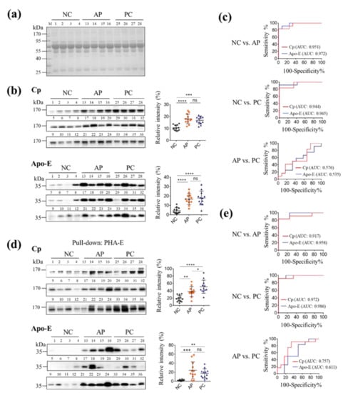 The expression of Cp and Apo-E and the expression of PHA-E-positive Cp and Apo-E. The protein concentrations of sera from 12 NC individuals (1–12), 12 AP (13–24), and 12 PC (25–36) patients were analyzed by CBB staining. The results of one gel were shown in (a), and another two gels can be seen in Figure S1. (b) Detection of the expression of Cp and Apo-E in the sera by Western blotting. An amount of 6 μg of serum proteins was applied for each sample. (c) Evaluation of serum Cp and Apo-E in diagnosis of AP and PC by drawing ROC curves. (d) Detection of the level of Cp and Apo-E in PHA-E pulled down sera by Western blotting. A total of 350 μg serum proteins for each sample was used in PHA-E pull-down experiment and 20 μL pulled-down serum proteins was loaded onto the gel. (e) Evaluation of Cp and Apo-E in PHA-E pulled-down sera in diagnosis of AP and PC by drawing ROC curves. The relative intensities of bands (b,d) were analyzed using Image J software, normalized with total protein signal in CBB staining (a and Figure S1), and finally statistically analyzed by Graphpad Prism 6.0. All values are means ± SD from 12 individuals of one group. NC, normal control; AP, acute pancreatitis; PC, pancreatic cancer; Cp, ceruloplasmin; Apo-E, apolipoprotein E; *, p < 0.05; **, p < 0.01; ***, p < 0.001; ****, p < 0.0001; ns, no significant difference.