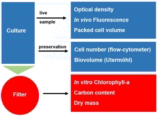 The determination of microalgal biomass is an essential component of cell cultivation and is commonly required in biotechnology, medicine and other disciplines [1]. Assessing the status of a culture and its growth performance calls for the rapid and efficient estimation of biomass. Various options are available to estimate biomass [2], with the selection depending on the focus of interest. For applied research and commercial cultivation, the biomass parameters must be robust, reliable and easy to measure. Importantly, the result must be quickly available as a fast decision-making tool, e.g., for starting the harvest or modifying the current culture conditions. Given a population doubling time of less than one day [3,4], the availability of such data on the following day may already be too late for operations.