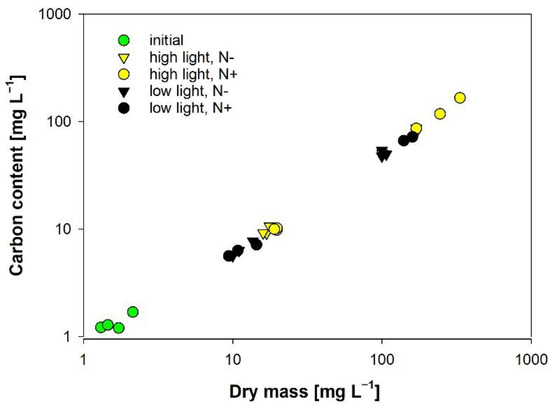 The carbon content of Anabaena torulosa grown in full BG11 medium (N+) and in nitrogen-depleted medium (N−) and under high and low light is about 50% of the total DM (r2 = 0.99, n = 27).