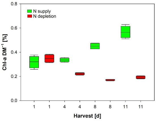 Our experiment revealed large variations of in vitro chl-a per DM (Figure 3) depending on growth conditions, which is in agreement with other studies [37,42]. The experiment clearly revealed that nitrogen depletion results in reduced specific Chl-a concentration (nitrogen is an element of the Chl-a molecule). Nitrogen supply enables high growth rates, thus increasing turbidity due to high cell densities. Cells react in increasing the cellular pigment content for optimal light absorption (Figure 3).