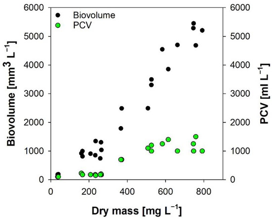 According to our experience (this experience and unpublished data), PCV can only be taken as a very rough estimate of algal biomass; the correlation between PCV and DM was moderate (Figure 4, r2 = 0.81, n = 25). Besides imprecise readings from the hematocrit “easy read” device, cell shape and density are critical factors. Simple and heavy forms will aggregate as compact pellets (Chlorella), whereas expanded, complex shapes (e.g., spirals of Limnospira) will result in low packing density; therefore, PCV cannot be converted into algal biovolume. Moreover, as centrifugation only works with cells heavier than the surrounding medium, specimens with low density will not settle due to buoyancy, thus resulting in low PCV. This presents an additional potential problem with organisms containing gas vesicles or lipid droplets. Exactly this phenomenon is observed in our experiment with Limnospira-containing gas vesicles (Figure 4). Notwithstanding, PCV in hematocrit tubes has already been applied for overall estimates of algal biomass [51,52,53].