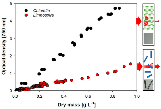 Comparing OD of two species Chlorella sp. and Limnospira fusiformis. Sketches on right: cuvette cross sections with higher OD of Chlorella caused by increased scattering due to many small cells (top) compared to the large filaments of Limnospira (bottom).