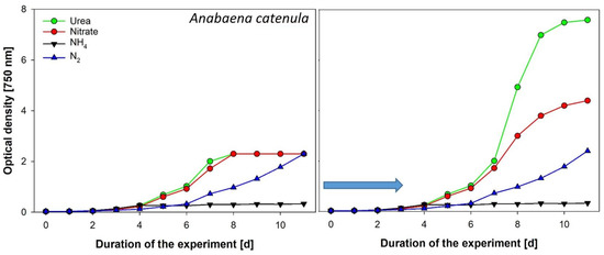 Growth experiment with the cyanobacterium Anabaena catenula supplied with different nitrogen sources (means of 3 replicates). Left: OD was measured without considering the upper absorbance limit of the spectrophotometer. Erroneous results are shown from which incorrect conclusions might be drawn. Right: samples were diluted at absorbance values > 1 (indicated by the blue arrow) and then multiplied with the dilution factor.