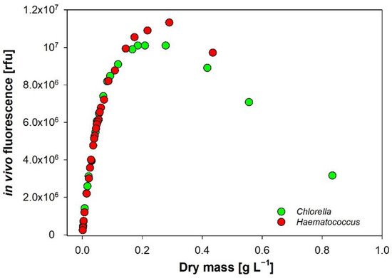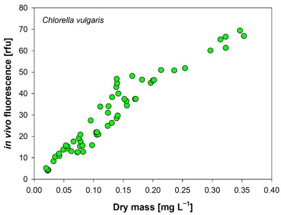 All oxygenic photoautotrophs contain the natural fluorochrome chl-a. The pigment is widely used as a proxy for biomass of in situ measurements of phytoplankton [65,66] and sometimes also for algal cultivation [16], although a blurriness similar to that with the spectrophotometric method is evident. Interestingly, IVF turned out to be a better predictor for algal biomass than in vitro chl-a, which was explained by a stronger fluorescence signal of chl-a of live cells during adverse growth conditions [67]. As the fluorescence signal depends on the properties of the specimens being cultivated and also on the culture conditions, it must be calibrated separately for different cultures [63]. Independently of the device used, IVF revealed the same patterns during culture development. Besides simple spectrofluorometers, an alternative is to use the minimum dark fluorescence F0 of PAM-fluorescence devices for IVF as long as the instrument settings are not changed during the measurement series. This is a promising approach because inexpensive devices are now available on the market.
