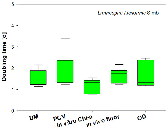 In a growth experiment with the commercially exploited cyanoprokaryote Limnospira fusiformis, we compared direct and indirect parameters of algal biomass (Figure 9). As these parameters are based on different units hindering direct comparisons, we calculated doubling times from the respective parameter (Figure 9). We found similar results, with only in vitro chl-a showing significantly lower doubling times, which could be traced back to variations in cellular pigment content during culture development (Kruskal–Wallis test, n = 27, H = 30,93). Besides PCV, OD also has a large variance, which probably reflects improper readings from the hematocrit tubes (PCV) and varying optical properties due to changes in cell morphology (OD).