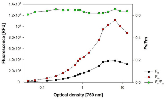 Optical measurements are strongly influenced by cell properties, and methods based on fluorescence are prone to IFE. This raises the fundamental question whether Fv/Fm is a robust parameter along different cell densities. This question is crucial because some devices on the market were developed for higher plants, which contain large amounts of pigments compared to suspensions. This implies that quite concentrated suspensions are necessary for stable readings. Moreover, new technologies and cheap components enabled the development of inexpensive battery-operated, handheld devices that also pave the way for use by non-academic institutions. Although Fv/Fm is not suitable for calculating growth rates and modelling primary productivity [67], it is a valuable biomarker to gain insight into the health status of oxygenic photoautotrophs during active growth [10,12,14,68,69] and storage [70].