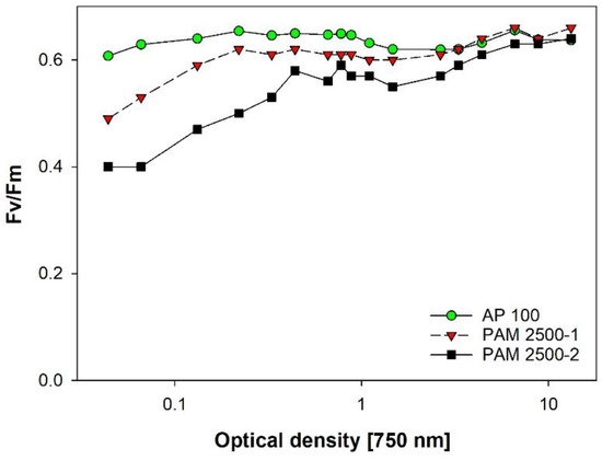 The comparison of three devices revealed an interesting pattern: as expected, PAM2500-2 equipped with a fiber-optic cable and low sensitivity showed reliable results only at OD > 1 (Figure 11). The generally low values compared to the other instruments are caused by the different optical geometry. PAM2500-1 was specifically designed for diluted algal and chloroplast suspensions. The cuvette holder allows perpendicular excitation and emission light paths, and the high-sensitivity detector enables stable signals even at low cell densities, which also minimizes the IFE and scattering effects. The AquaPen AP100 showed a surprisingly even signal over a wide range of OD (Figure 11). We assume that the specific geometry of the optical path—with the excitation light and the fluorescence detector directly attached to the cuvette holder—is responsible for this excellent performance.