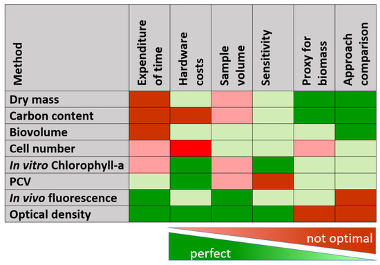 Summary of commonly used methods for estimating microalgal biomass (PCV = packed cell volume, in vitro Chlorophyll-a = spectrophotometric chl-measurement after solvent extraction). Colors represent the suitability for the respective property.