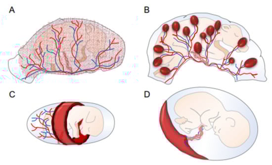 Structural diversity of placentas as classified by the distribution of chorionic villi. Gross anatomy showing diffuse (pigs), cotyledonary (ruminants), zonary (cats and dogs), and discoid (rodents and primates). (A): Diffuse placentas have a uniform distribution of chorionic villi covering the chorion’s surface. (B): Cotyledonary placentas have numerous, discrete, button-like structures called cotyledons and they join with the maternal caruncle, forming a placentome. (C): Zonary placentas have a band-like zone of chorionic villi, of which both edges are primary exchange zones. (D): Discoid placentas form a regionalized disc-like structure. Red and blue lines are the artery and vein, respectively, which are joined to an umbilical cord.