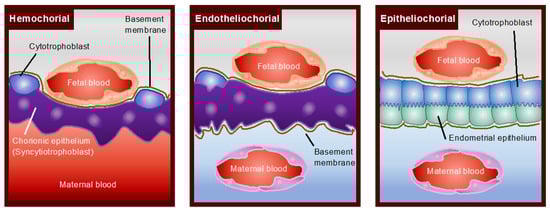 The chorionic membrane consists of mono-, di- or tri-layers of trophoblast cells. In hemochorial placentation, the human placenta, discoidal in shape, is classified as a monochorial interface as well as exhibiting villous maternal–fetal interdigitations. In murines, including Muridae and Cricetidae, a labyrinthine placenta is developed in the hemotrichorial organization with three trophoblast layers [59]. The first layer closest to the maternal stroma and/or decidua consists of mononucleate cytotrophoblast cells, and the second layer consists of a syncytiotrophoblast cell layer, whereas the third trophoblast layer consists of cyotrophoblast cells [60].