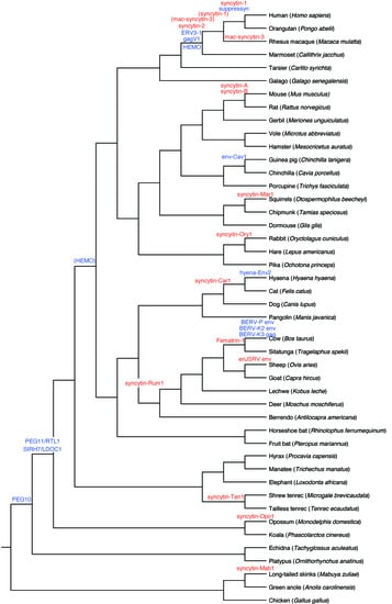 Multiple acquisitions of ERV-derived genes expressed in placenta. The dendrogram indicates a taxonomic relationship of 45 species, including 42 mammals, two reptiles, and one bird. The phylogeny was obtained using the TimeTree website (http://www.timetree.org, accessed on 2 July 2022 [14]). ERV-derived genes expressed in the placenta are illustrated at the location of the presumed inserted lineage. The red or blue color indicated whether the ERV-derived genes were reported to have fusion activity or not, respectively. A gene in parentheses indicated the time of insertion where the gene without parenthesis is when it has acquired function. The details of each ERV-derived gene shown in the figure are summarized in Table 1.