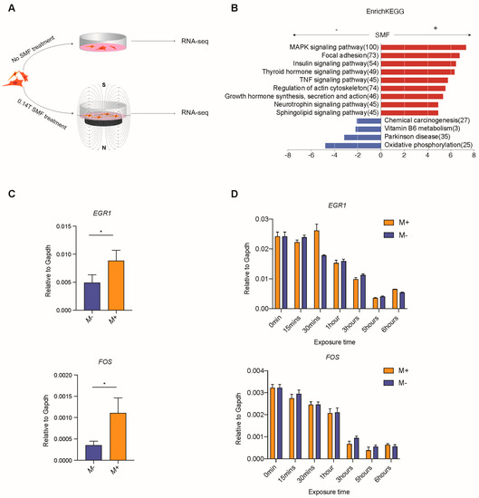 Exposure to SMF upregulates immunoregulatory factor genes and MAPK-signal-pathway-related genes in MSCs. (A) Schematic of experimental approach. (B) Bar chart of the gene expression differences between M+ and M− cell samples by RNA-seq of various KEGG function terms. (C) RT-qPCR analysis for expression of EGR1 and FOS in M+ (magnetic field induction 140 mT) and M− MSCs samples cultured for 72 h. Asterisks indicate statistical significance of the separation between the mean of the medians according to unpaired two-tailed t-test between conditions. ns p > 0.05; * p < 0.05. (D) Time-course RT-qPCR analysis for expression of EGR1 and FOS in M+ and M− MSCs samples cultured for 0–6 h. Data are mean ± s.d., N = 3 independent experiments.