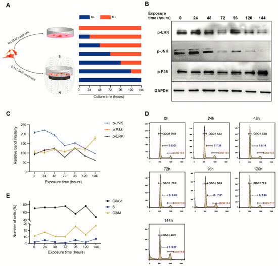The enrichment of the GO term MAPK signaling pathway for the M+ upregulated gene in Figure 2B raises the hypothesis that SMFs promote MSC proliferation by the MAPK signaling pathway. Since the MAPK signaling pathway is divided into three subclasses—ERK, P38, and JNK [31]—we detected their activation by Western blot. The experimental setup is illustrated in Figure 3A, and the results show that both p-ERK1/2 and p-JNK protein demonstrated a periodic oscillation according to the SMF exposure time. Both p-ERK1/2 and p-JNK experienced a continuous drop when exposed to SMF for 72 h, while a significant climb was observed when the SMF exposure time lasted for 96 h (Figure 3B,C) and oscillated back to a relatively lower expression level at 120 h and 144 h, whereas p-P38 dropped at 24 h of SMF exposure and climbed back to the original expression level when exposed for more than 24 h. Furthermore, cell cycles of samples with different exposure times were measured using flow cytometry (Figure 3D). The results for the cell-cycle distribution are resounding; as the SMF exposure time increases from 0 h to 144 h, the G2/M phase follows a similar trend to the p-ERK and p-JNK expression (Figure 3E). Such a transient change in p-ERK1/2 and p-JNK protein expression matches with the SMF-induced proliferation phenotype described in Figure 1.