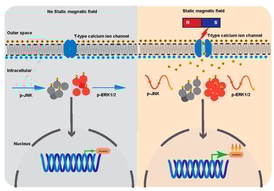 In this study, we investigated the biological effects of SMF on MSCs and found that SMFs promote the proliferation of MSCs. Specifically, MAPK signaling pathways are sensitive to SMF stimulation, and the activation of ERK and JNK signaling pathways seems to oscillate periodically with the exposure time of the SMF. Importantly, we demonstrated that T-type calcium ion channels mediated the SMF-dependent MSC proliferation (Figure 5).