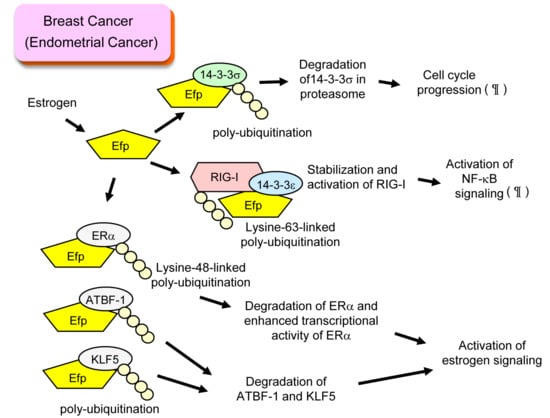 Two other transcription factors, Krüppel-like factor 5 (KLF5) and AT motif binding factor 1 (ATBF-1), are also reported as substrates of Efp in ER-positive breast cancer [25,26]. The estrogen-dependent degradation of these proteins was observed, which was explained by concomitant induction of Efp and poly-ubiquitination of these proteins. Since both KLF5 and ATBF-1 were shown to suppress estrogen signaling in breast cancer cells [27,28], Efp is suggested to promote breast cancer by enhancing estrogen receptor signaling (Figure 1).